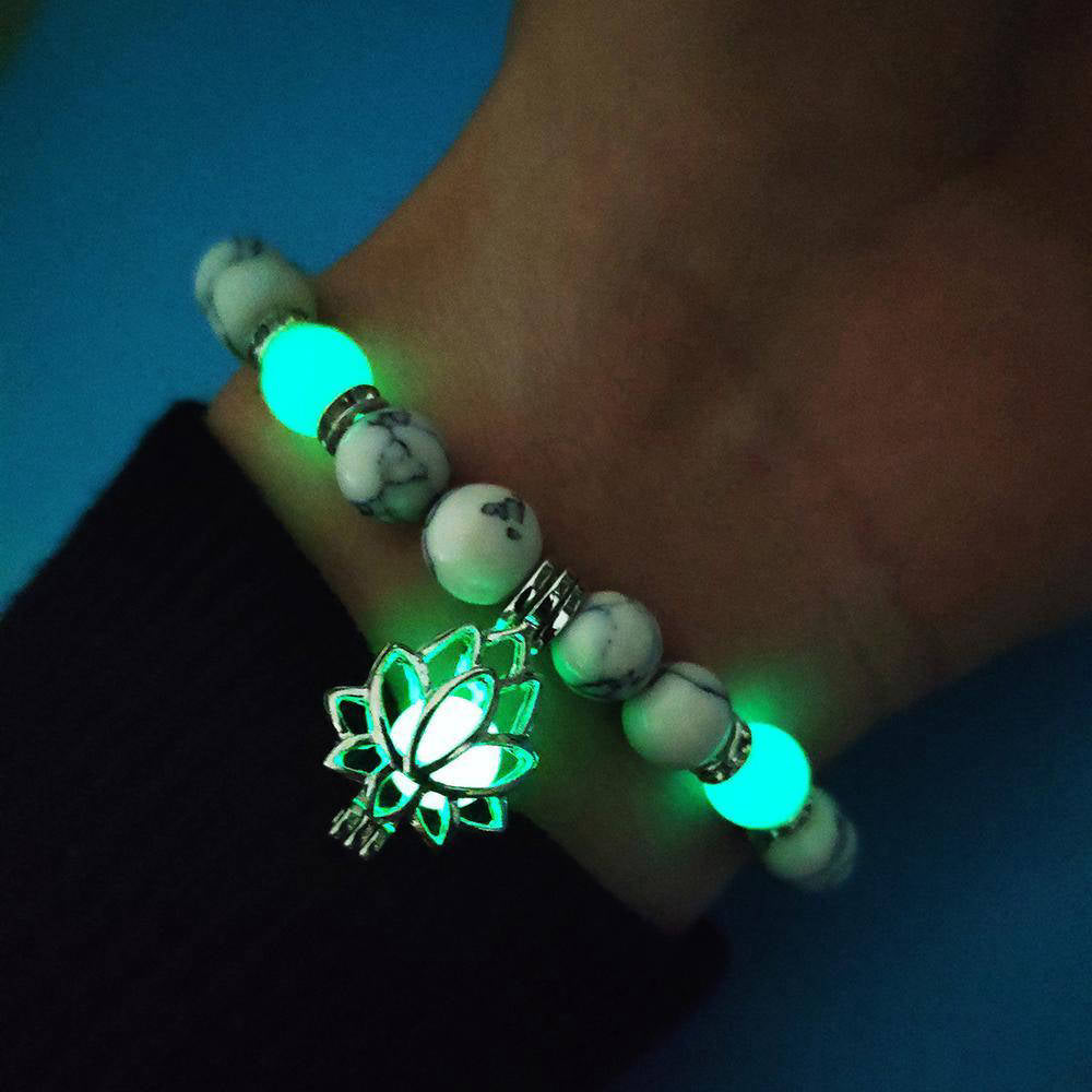 Ce Bracelet Lotus Arbre de Vie est absolument unique ! Une pierre naturelle phosphorescente est contenue dans le Lotus. Si vous la chargez en lumière, elle brillera dans le noir !