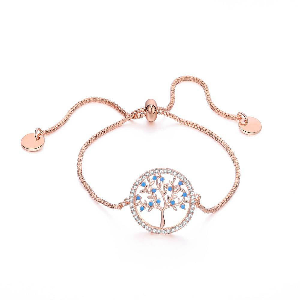 Ce beau Bracelet Or Rose reflète beauté et élégance ! L’Arbre de Vie est mis en valeur par des petits cristaux argentés et des belles petites pierres bleues sur ses branches !