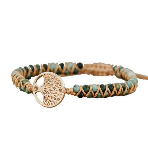 Ce Bracelet en Jaspes Vertes est un petit bijou ! Entièrement fait à la main, ce Porte-bonheur Arbre de Vie est en pierres naturelles. Son beau Vert est mis en valeur par la corde marron !