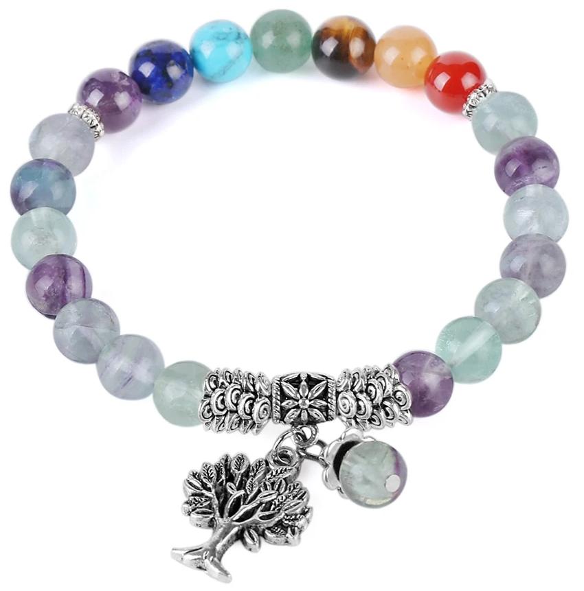 ✔️ Composé de pierres naturelles de Fluorite. Les 7 chakras sont eux représentés par de l’Agate Rouge, Jade Orange, Oeil de Tigre, Aventurine Verte, Turquoise, Lapis Lazuli et Améthyste.