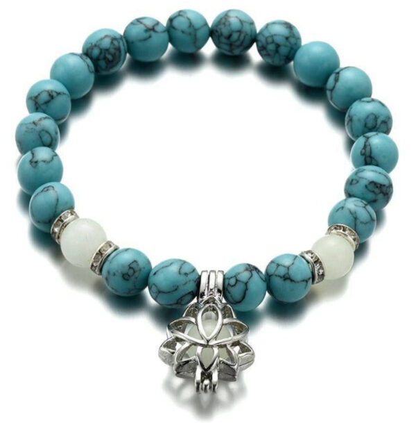 Ce Bracelet Lotus Arbre de Vie est absolument unique ! Une pierre naturelle phosphorescente est contenue dans le Lotus. Si vous la chargez en lumière, elle brillera dans le noir !