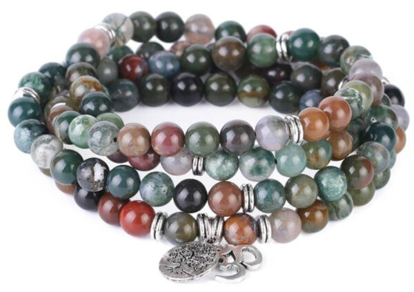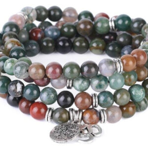 La pierre d’Agate Indienne est harmonisante et favorise l’équilibre. Elle offre de jolies teintes de vert, de gris, de marron et de rose. Ce Mala traditionnel est composé de 108 perles naturelles, ainsi que de deux symboles spirituels sacrés : l’Arbre de Vie et le AUM, la vibration divine.