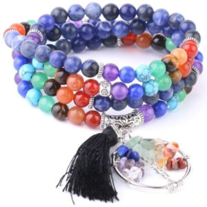 Composé de 108 perles, ce joli Mala a été réalisé avec des pierres semi-précieuses naturelles, afin de représenter les 7 chakras. Il représente la sagesse profonde de l’Arbre de Vie, soulignant l’importance de tendre vers un équilibre parfait entre les énergies du ciel et de la Terre.