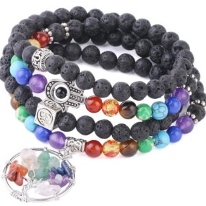 Nous sommes heureux de vous présenter ce nouveau Mala de méditation indien. Comme vous pouvez le voir sur les photos, il est composé principalement de roche volcanique. Des séries de 7 pierres semi-précieuses représentent les 7 chakras. Toutes sont entièrement naturelles.