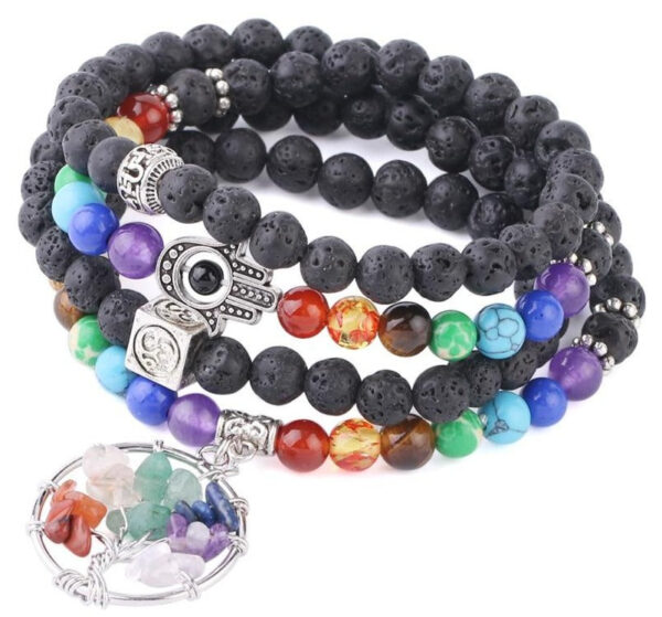 ✔️ Composé de pierres naturelles semi-précieuses : Lapis Lazuli, Agate Rouge, Jade Orange, Oeil de Tigre, Aventurine, Améthyste et Turquoise. La pierre dominante est la roche volcanique.