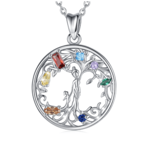 Découvrez un beau collier en argent, incarnant la féminité. L’arbre de vie prend la forme d’une femme, donnant le bras à son enfant. Plusieurs pierres ornent le bijou, afin de lui donner plus de profondeur.