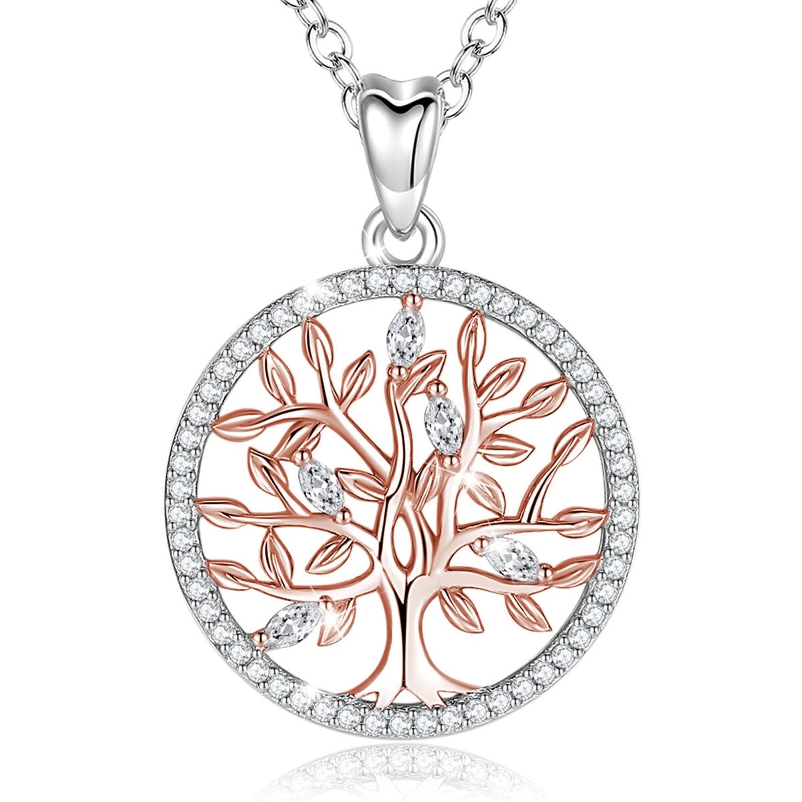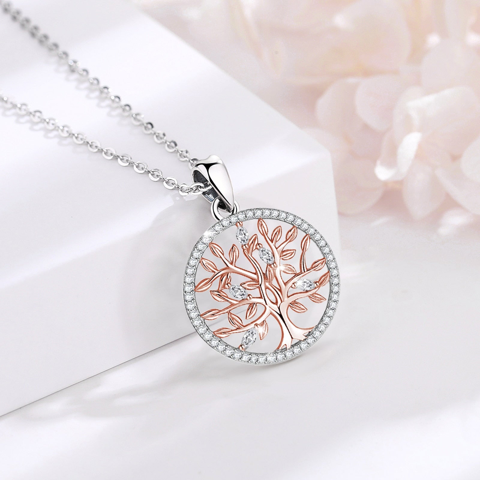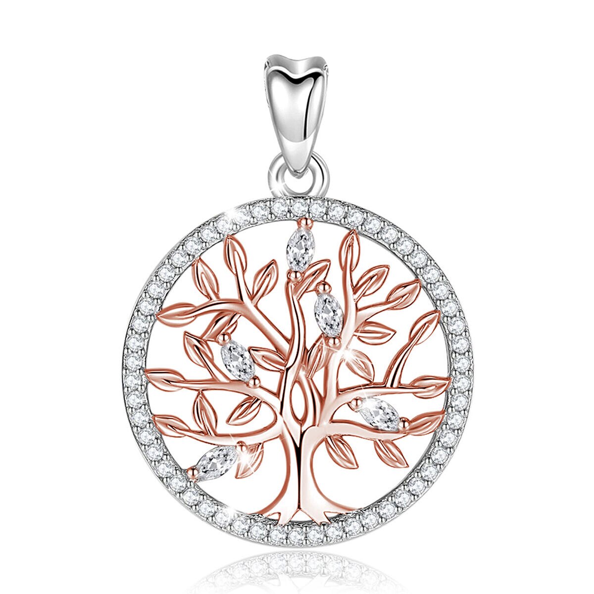Médaille arbre de vie en or rose. Bordure en argent pur 925 sterling. Ce bijou est disponible en pendentif seul, ou bien avec une chaîne en argent de 45cm.