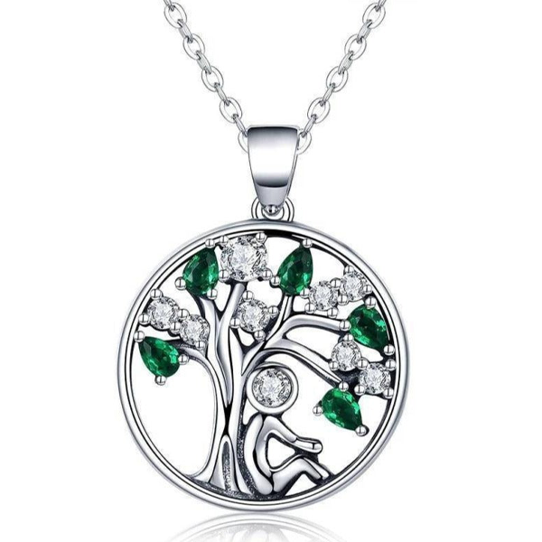 Ce Pendentif très original représente un homme assis au pied d’un Arbre de Vie. Ce bijou est conçu en Argent Massif et en Zircon. Le Vert émeraude contraste particulièrement bien.