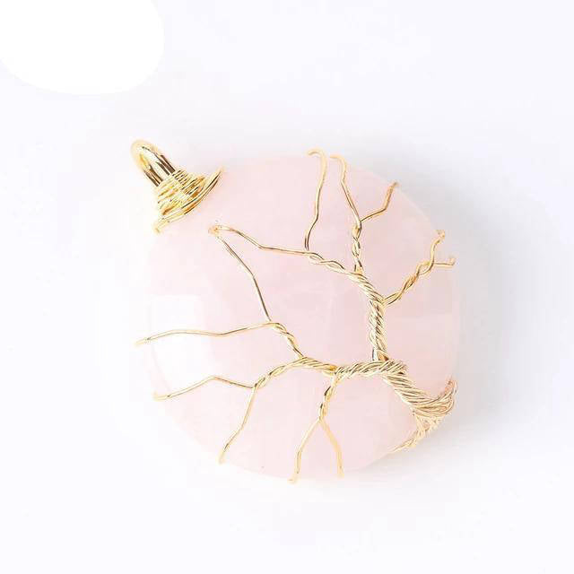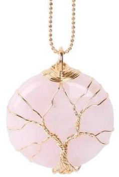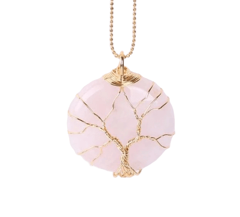 Ce joli Pendentif en Quartz Rose naturel représente l’Arbre de Vie. Surnommée la pierre de l’Amour, elle ressort particulièrement belle et harmonieuse sur ce collier. L’Arbre est plaqué or.