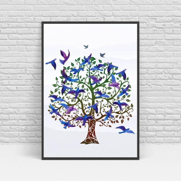 Cette belle toile représente l’Arbre de Vie sous des nuances de bleu et de violet. De nombreux oiseaux volent autour de l’Arbre !